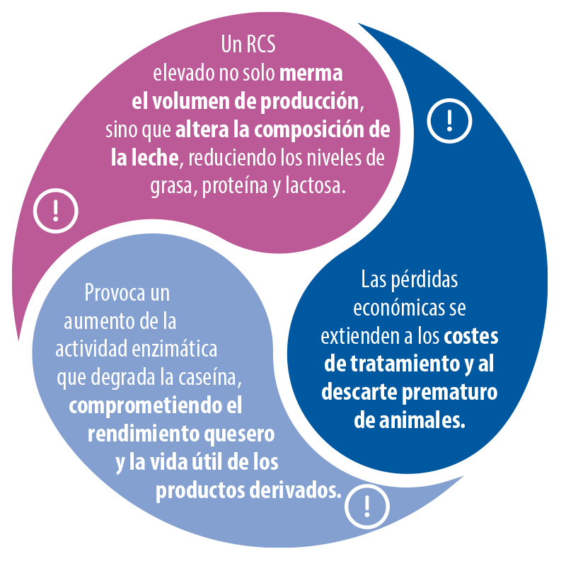 Cifras superiores a 100.000 células/mL alertan de una posible mastitis, a menudo subclínica y sin sintomatología visible.
