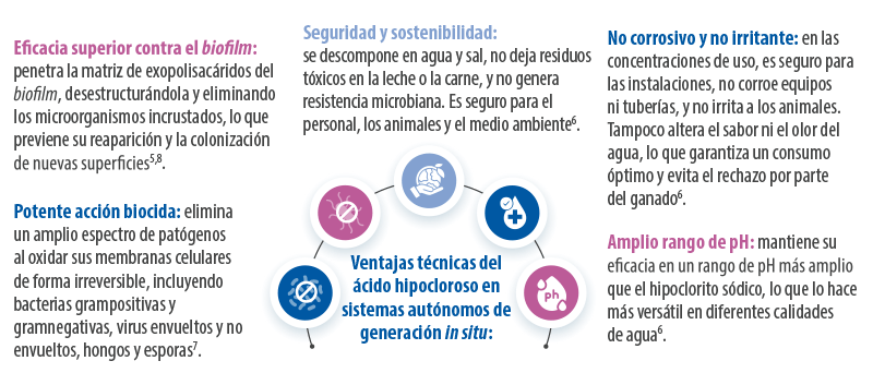 Frente a desinfectantes tradicionales como el hipoclorito de sodio, que presentan limitaciones en eficacia contra el biofilm, dependencia del pH y formación de subproductos no deseados2, hay una solución tecnológicamente avanzada y biológicamente compatible: el ácido hipocloroso.