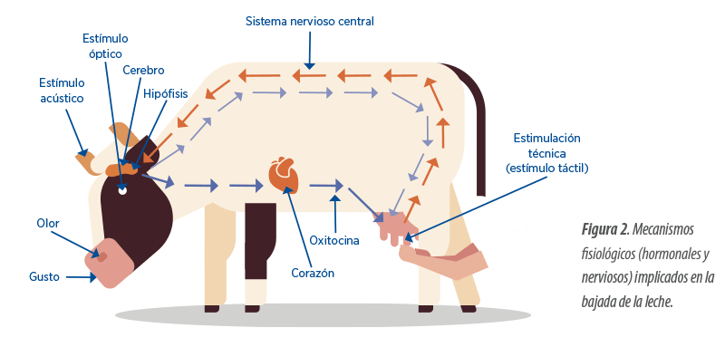 Cuando se estimulan las terminaciones nerviosas cutáneas del pezón mediante la rutina de ordeño, la señal nerviosa se transmite a través de las vías aferentes del sistema nervioso hasta el hipotálamo. Al recibir esta señal, el hipotálamo envía una orden a la hipófisis para que libere la hormona oxitocina al torrente circulatorio.