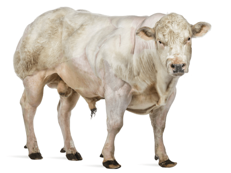 El Azul Belga se caracteriza por su musculatura extrema, producto de una mutación natural en el gen de la miostatina, que inhibe el desarrollo normal del músculo.