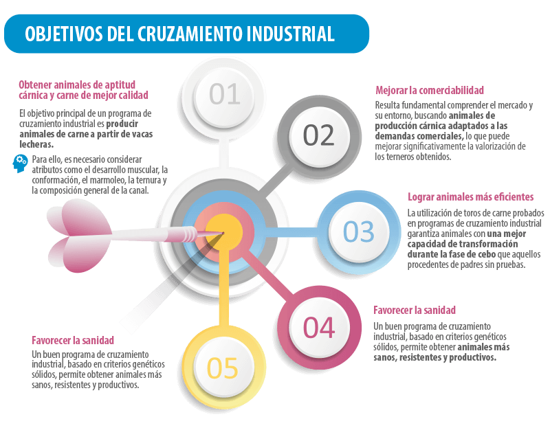 Entre los principales aspectos productivos que se buscan mejorar mediante el cruzamiento industrial destacan la calidad de la canal, la ganancia de peso, la fertilidad, la precocidad, el marmoleo y la terneza.