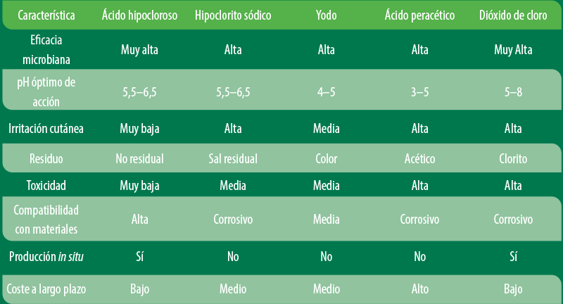 El HOCl es menos corrosivo, más seguro y más sostenible que productos tradicionales como hipoclorito sódico, yodo o ácido peracético:
