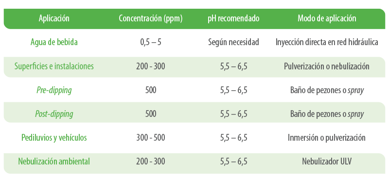 Su eficacia es alta incluso a bajas concentraciones (0,5–5 ppm) y no altera el sabor del agua ni afecta la ingesta de los animales. |